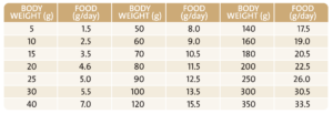 Small Carnivore Food can represent upto 80% of the total diet. Supplement with crickets, moths, grasshoppers, spiders and day old mice or chicks.